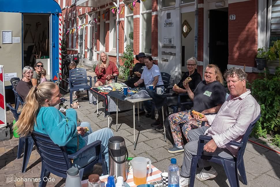 Op zaterdag 30 augustus was het zover: biologische planten van Stadskwekerij de Kas werden in de tuintjes gezet, bewoners en vrijwilligers hielpen volop mee. “Het was echt feestelijk,” zegt Karin. “Buurvrouw Veronica zorgde voor koffie, thee en broodjes, er hingen vlaggetjes en via Opzoomer Mee was er een keetje geregeld met tafels, stoelen, een kruiwagen en gereedschap. Het terrasje die dag was naast de trossen tomaten in Veronica’s geveltuintje.” Niet iedereen was in staat om zelf aan de slag te gaan, maar daar was een oplossing voor. René: “Voor een buurvrouw hebben we nieuwe plantenbakken getimmerd die vervolgens zijn beplant. Zo deed iedereen toch mee.”