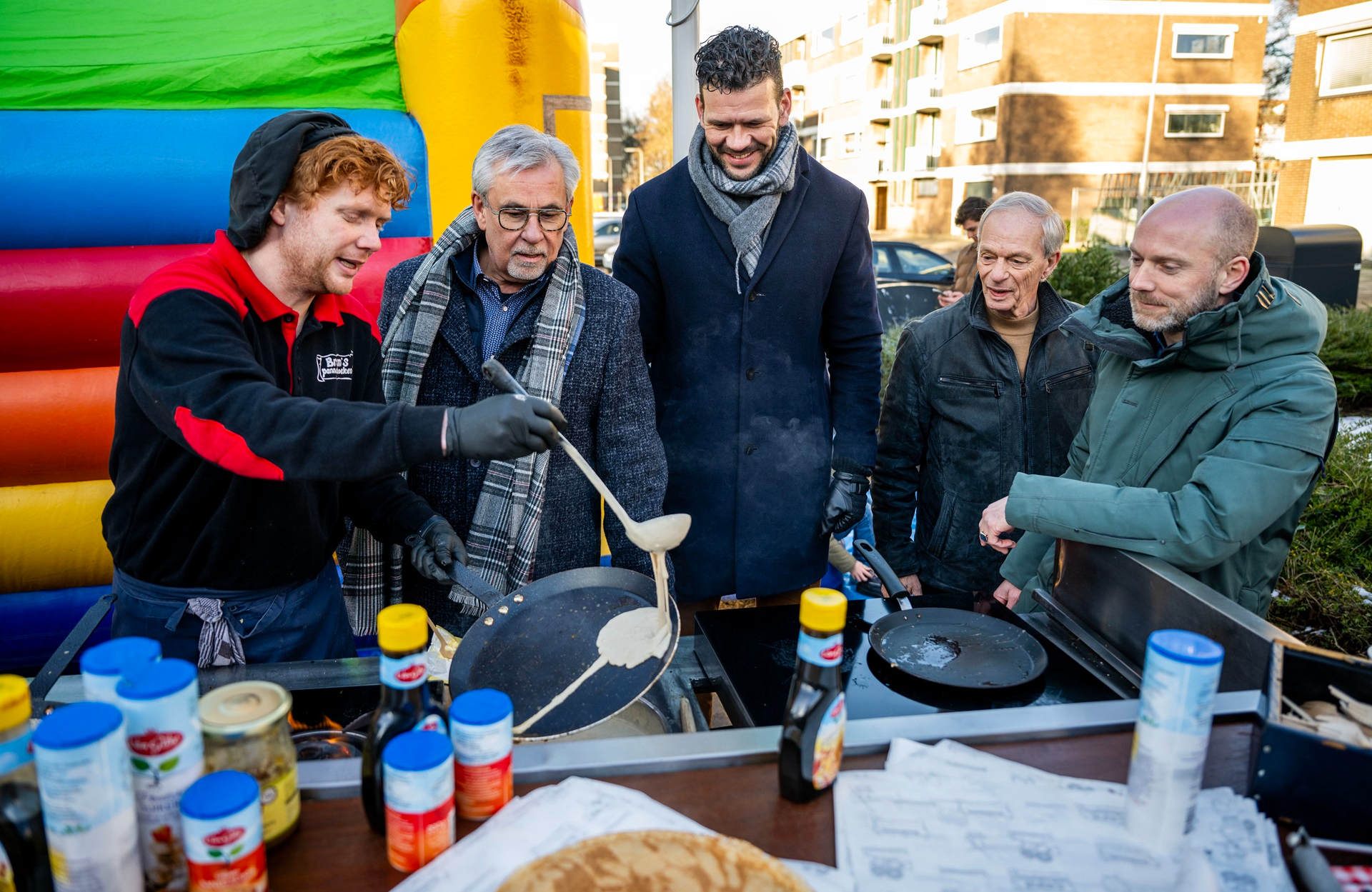 De sprekers toonden hun bakkunsten tijdens het pannenkoekenbakken op inductiekookplaat. Een ludieke start van het eerste verduurzamingproject in de Florabuurt Capelle! Bewoners konden alvast de kunst afkijken. Bij de verbeteraanpak maken zij ook de overstap naar elektrisch koken.