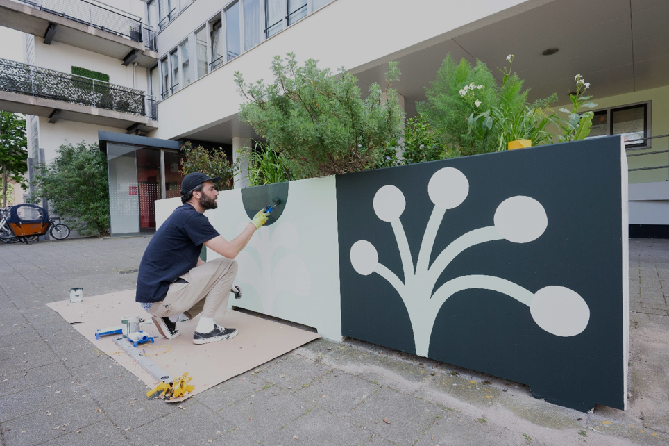 Voordat Gino aan de slag ging, overlegde hij met Stefan van Bureau Kruisbestuiving. "Hij is bezig met het vergroenen van de buurt, daar wilde ik met mijn schetsen op aansluiten. Ook sprak ik met de buurtbewoner die zich voor de plantenbakken had ingezet, om zijn ideeën te horen."