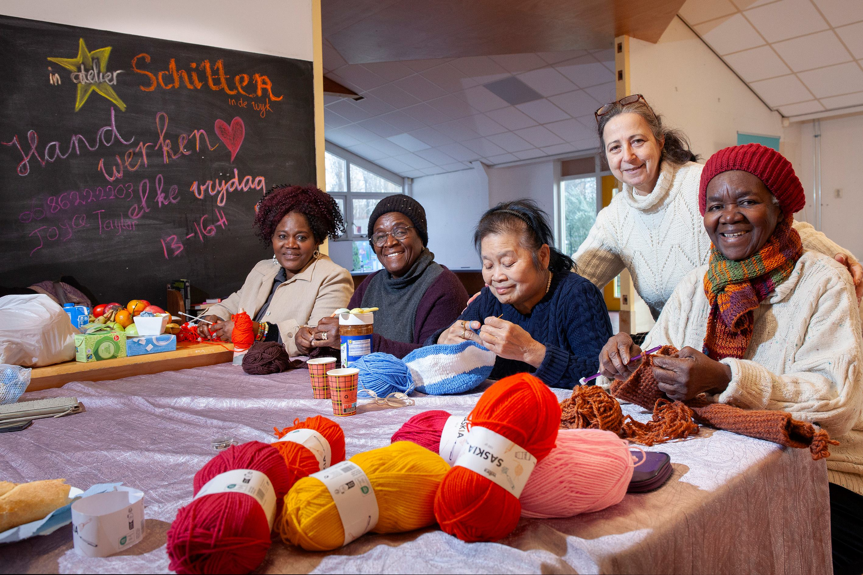 Olga en vrijwilligers geven breicursus in de Warme Huiskamer. (Tekst gaat door onder de afbeelding.)