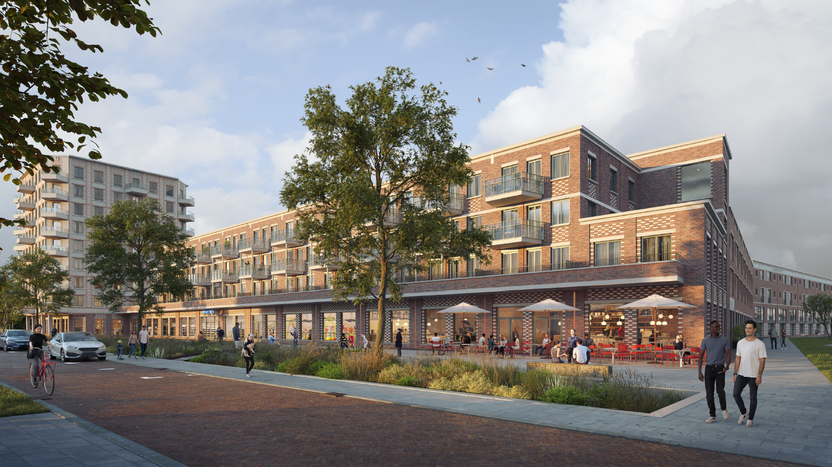 VORM ontwikkelde een concept waarin sociale cohesie prioriteit heeft gekregen. Dat gebeurt onder meer met een collectieve binnentuin, vormgegeven als een vallei. Daarmee wordt automatisch een oplossing gecreëerd om auto’s uit het zicht te parkeren. Jop: ‘Normaal gesproken zit een parkeergarage ondergronds. In dit project is een talud gemaakt waardoor je geen helling hoeft te overbruggen. Met een parkeerliftsysteem kunnen de bewoners van de koopwoningen twee auto’s kwijt op één parkeerplaats.’ Ook uiteenlopende functies zoals een supermarkt, horeca en meerdere maatschappelijke ruimtes, waarbij gedacht wordt aan een kinderdagopvang, buitenschoolse opvang en een gezondheidscentrum, zijn straks terug te vinden in de plint van het project.