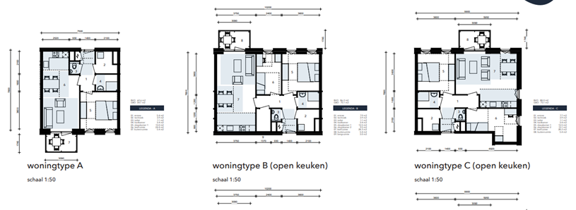 • Type C: Deze woningen van circa 75 m2 hebben twee slaapkamers en een balkon. Bij dit type woning kan er een open of een gesloten keuken zijn.